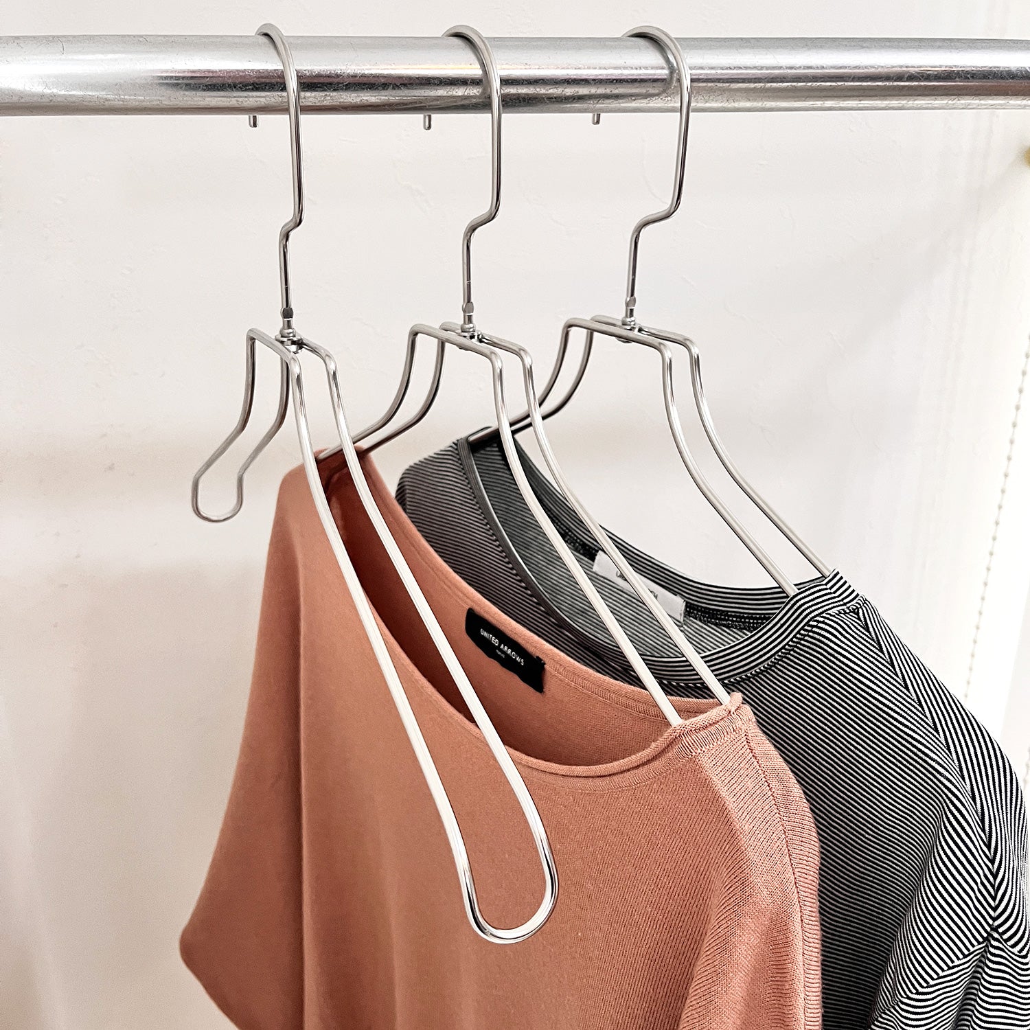 レディース用のストレートタイプのステンレスハンガーです。 肩厚30mmのストレートタイプのハンガーで、Tシャツやボタンシャツ・ブラウスからジャケットまで幅広く活躍する、汎用タイプのハンガーです。