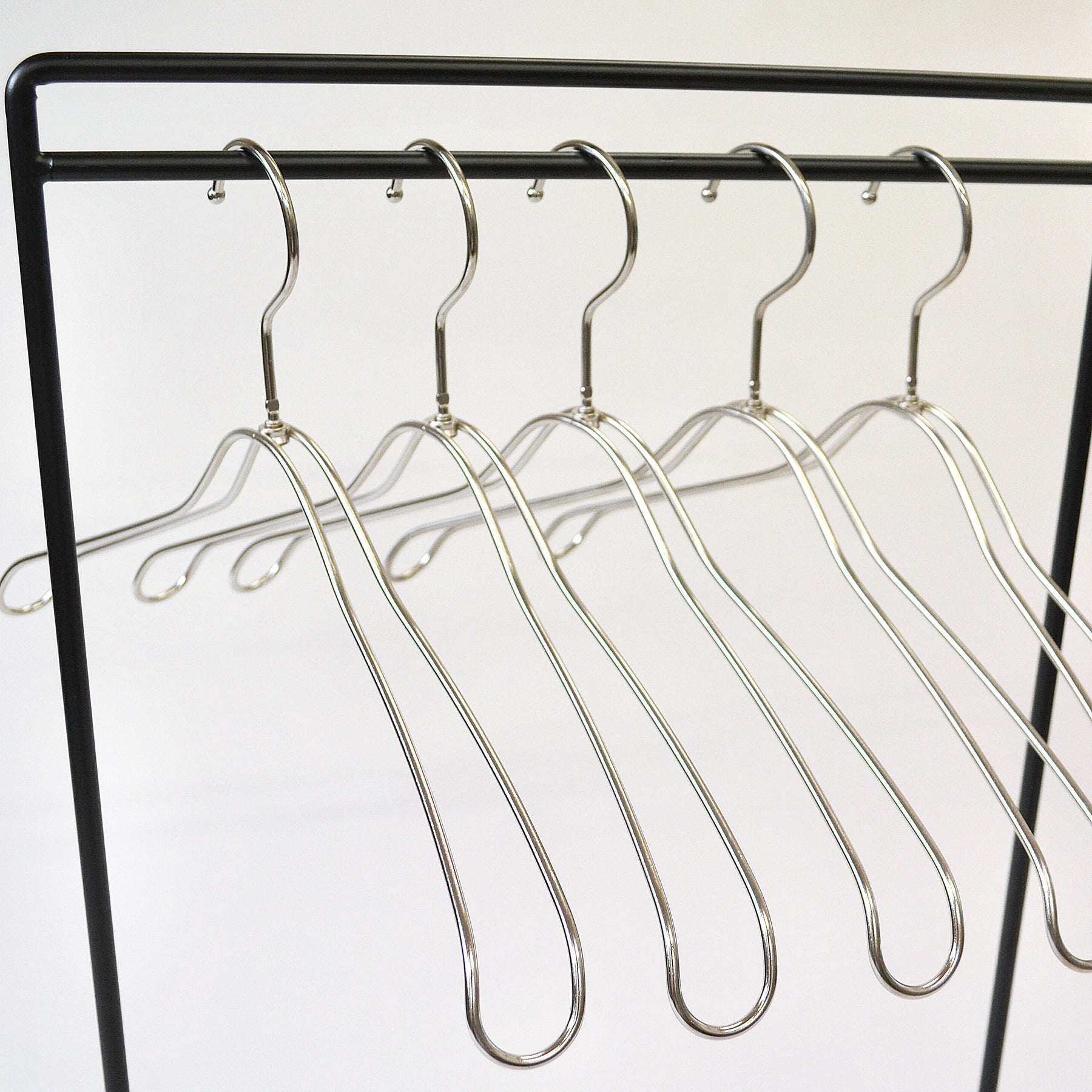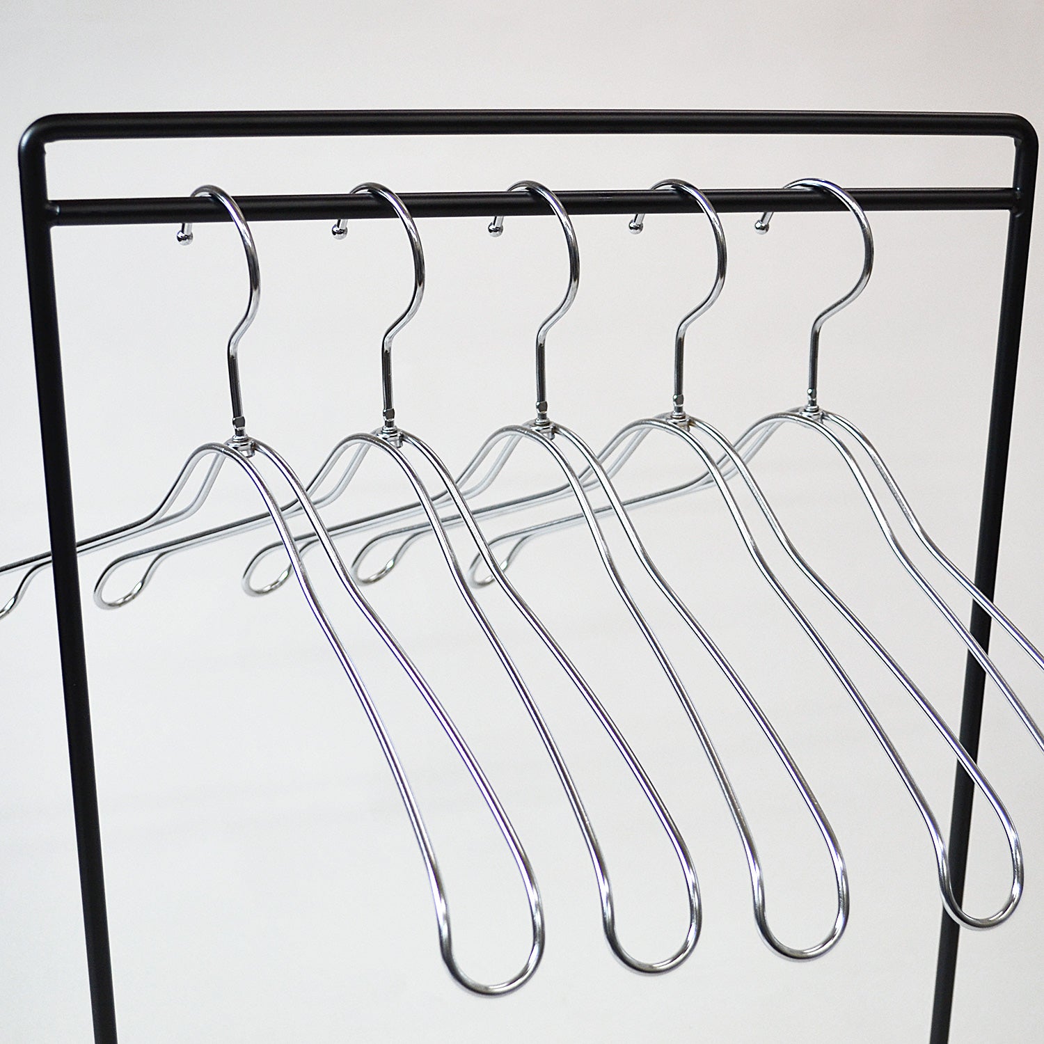 中央から肩先に向けてカーブ(湾曲)し、先端はやわらかく服を立体的に美しく表現します。全体的に丸みを帯びたデザインで、フックは回転式の為、角度を変えてハンガーラックに掛けることも可能です。