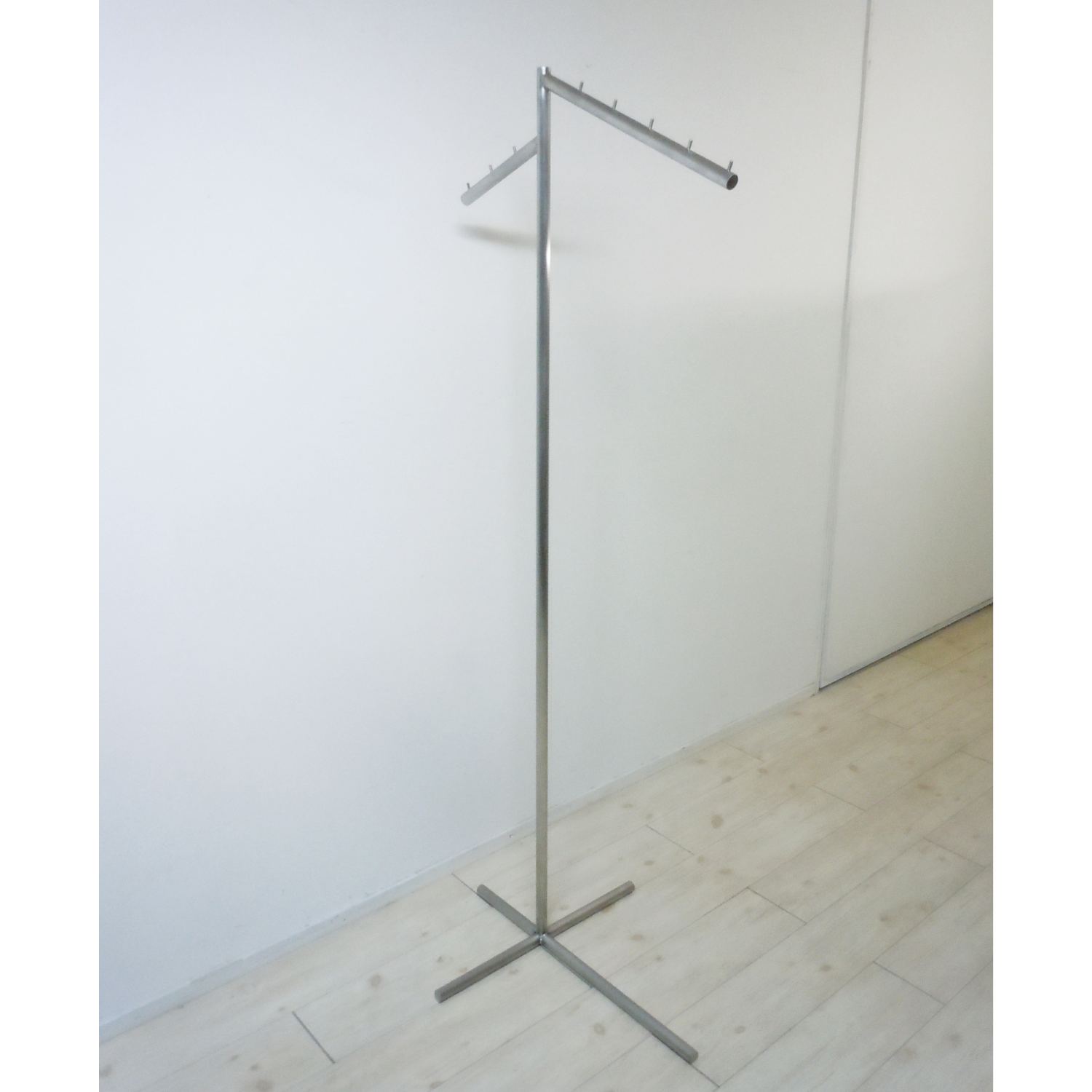余計な装飾を排したスリムでミニマルなデザインのステンレスヘアライン仕様のツインラックです。バーの上にはハンガーが落ちないよう滑り止めのピンが入っており、最大5点商品を掛けて陳列することが出来ます。傾斜パイプは商品の正面を見せるフェイスアウトに特化しており、高さ違いによって後ろにかかった商品もきちんと認識できる作りとなっています。そのため商品の柄やカラー展開をみせるのに適しています。