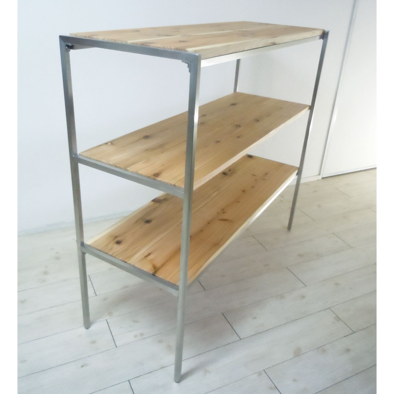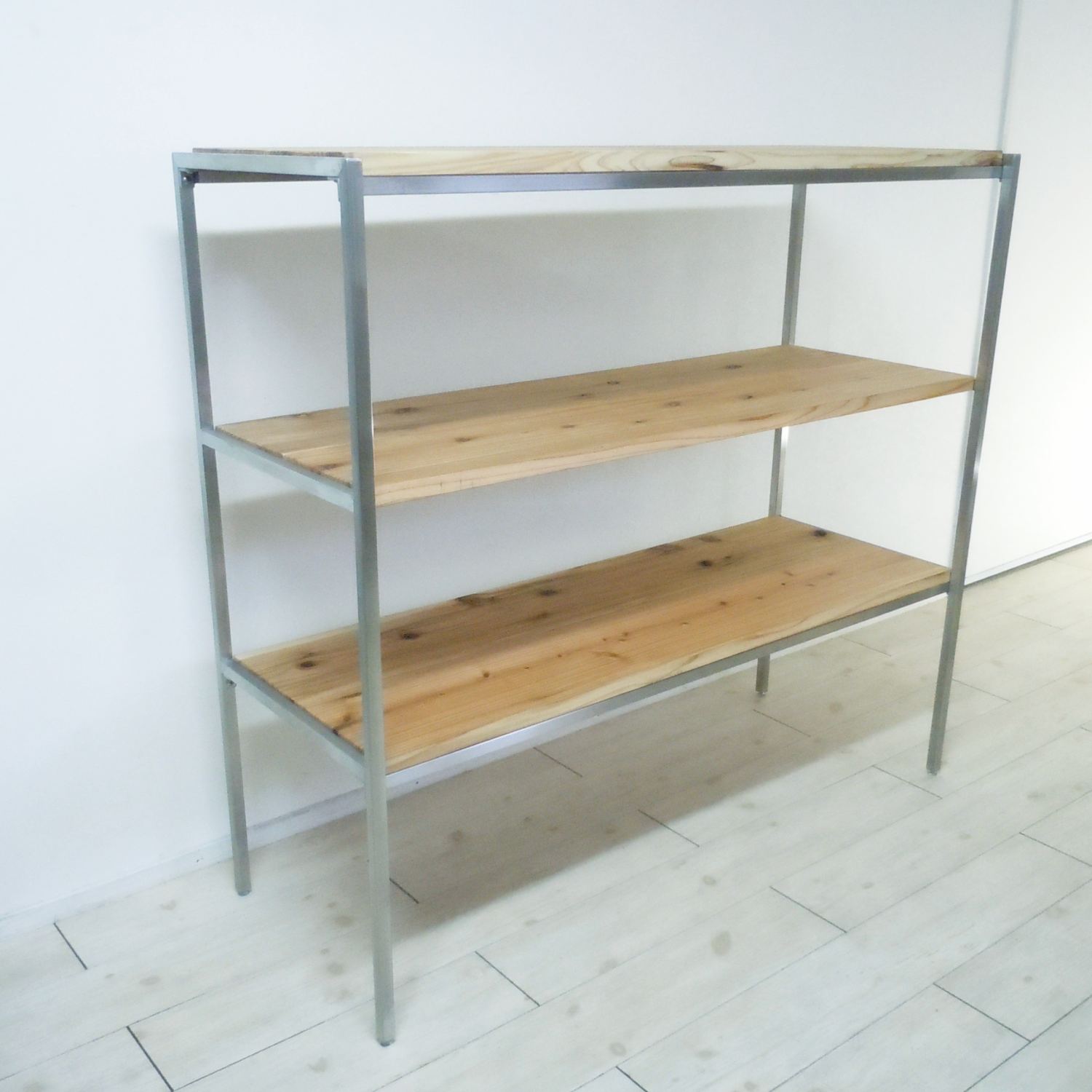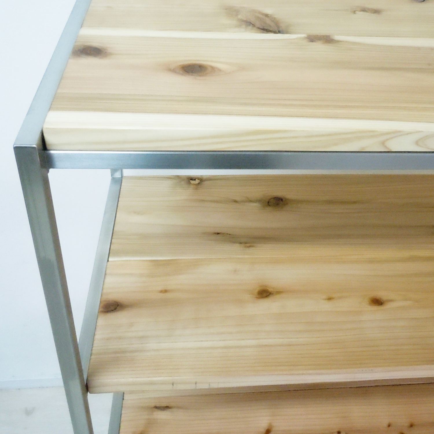 美しさと強さを兼ね備えたステンレスヘアライン・フレームのシェルフです。棚板はご希望カラー(*カラーはオーダー製造についてをご参照ください)に合わせて製作いたします。